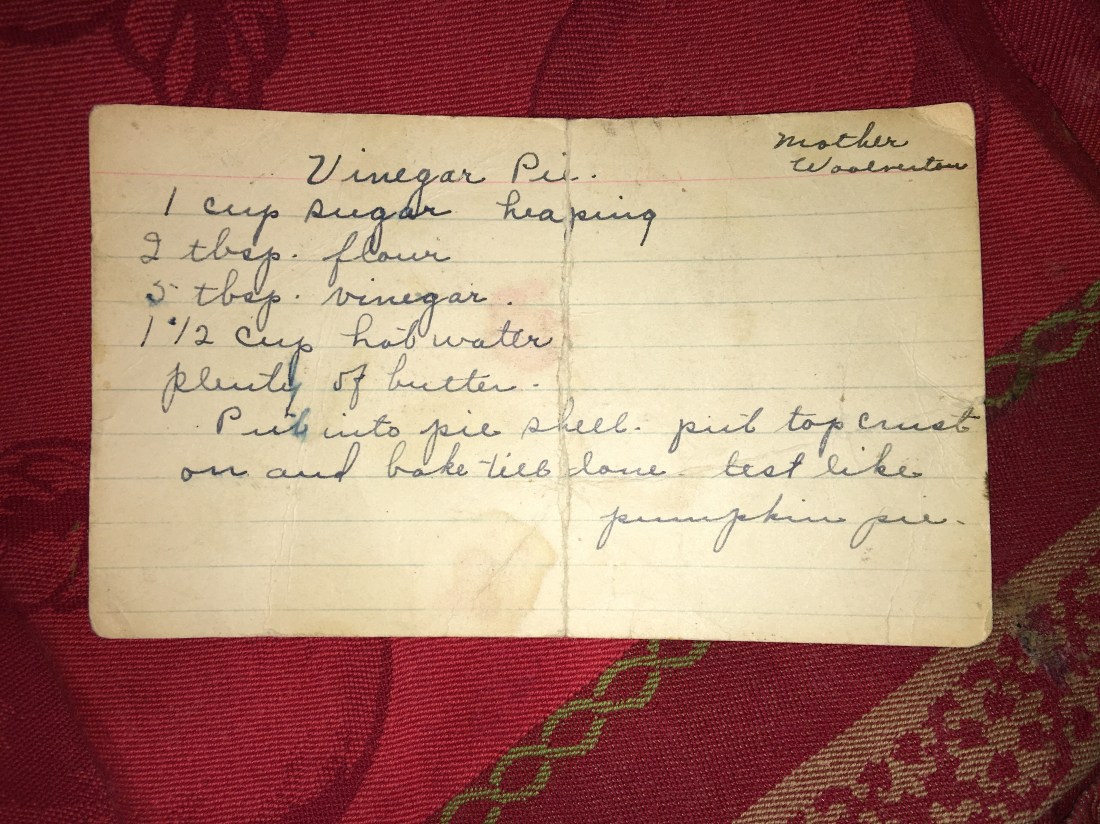 i have a recipe from my Grandma’s tin, handwritten and a bit faded. it’s for Vinegar Pie. she had won a pie baking contest one year (bad year for fruit??) with this pie. my mind conjures up visions of sour faced judges, fresh from the pickle competition…